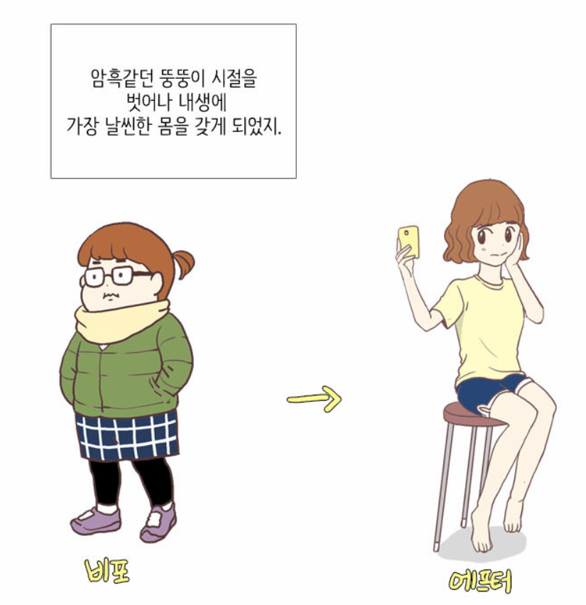 고교 입학 전, 다이어트에 성공했기 때문이었죠. 살을 뺀 현재의 모습에 만족감이 넘치던 나리. 나리는 설레임 가득 담은 체로 첫 등교를 하고 있었습니다. 그런데 자신의 설렘을 한 순간에 날려버린 사람들이 등장을 했죠. 나리의 뒤에서 반갑게 자신의 이름을 부르는 친구. 그녀는 빛나는 외모에 무엇 하나 꿀릴 것이 없는 친구인 엄친아 임유나였습니다.